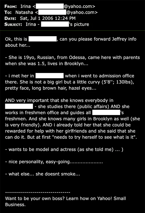 A bit of a warning before I share the next email: it may be a little disturbing for some. In this, Epstein’s female contacts shop new girls: