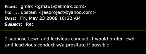 “Question,” Epstein wrote to her on May 23, 2008. “Which one do you prefer,,, lewd and lscivious conduct ,, or procuring minors for prostituion.” At the time, Epstein’s defense lawyers were closing in on a generous plea deal with federal and state officials in Florida, and Epstein was trying to negotiate the state charges to which he’d plead guilty. Maxwell’s response was matter-of-fact: “I suppose Lewd and lecivious conduct..I would prefer lewd and lescivious conduct w/a prositute if possible”